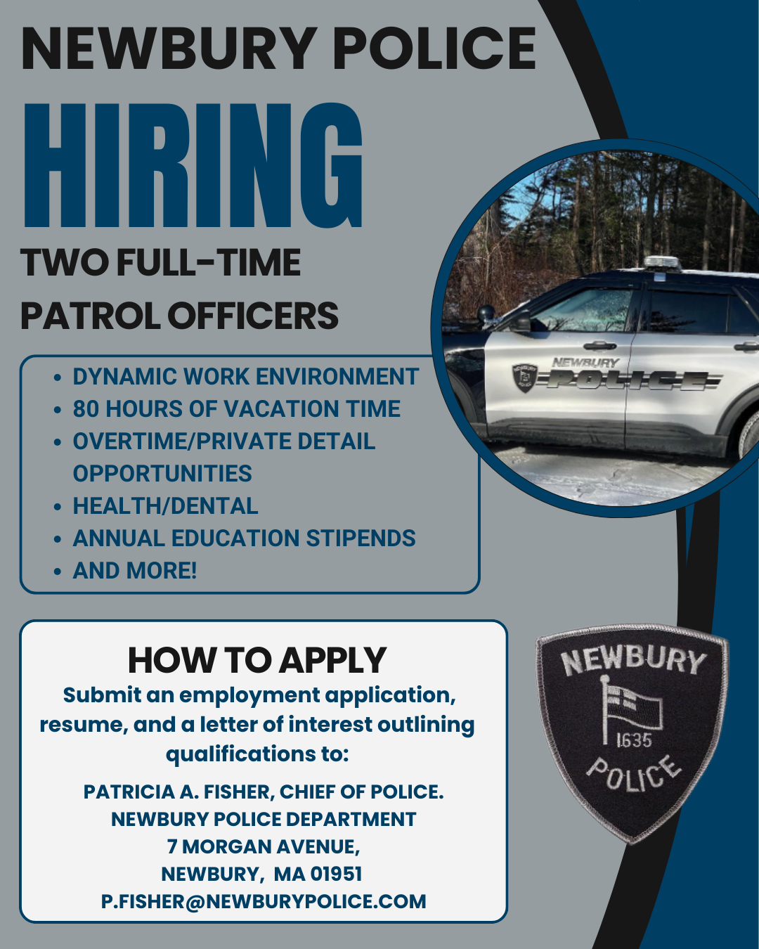 To apply, send a cover letter and resume to p.fisher@newburypolice.com.